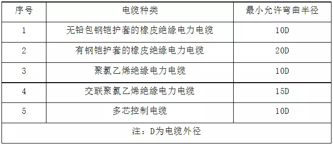 無鎧裝電纜,應不低于電纜外徑的6D;鎧裝或銅帶屏蔽電纜,應不低于電纜外徑的12D;屏蔽軟電纜,就不低于電纜外徑的6D。