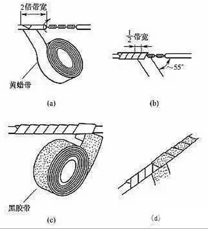 導線連接處的絕緣處理通常采用絕緣膠帶進行纏裹包扎。一般電工常用的絕緣帶有黃蠟帶、滌綸薄膜帶、黑膠布帶、塑料膠帶、橡膠膠帶等。絕緣膠帶的寬度常用20mm的,使用較為方便。