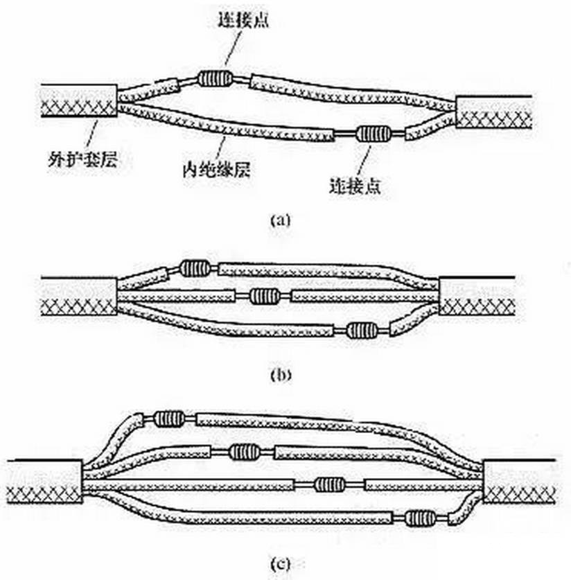 (7)雙芯或多芯電線電纜的連接。雙芯護套線、三芯護套線或電纜、多芯電纜在連接時,應注意盡可能將各芯線的連接點互相錯開位置,可以更好地防止線間漏電或短路。圖11(a)所示為雙芯護套線的連接情況,圖 11(b)所示為三芯護套線的連接情況,圖11(c)所示為四芯電力電纜的連接情況。