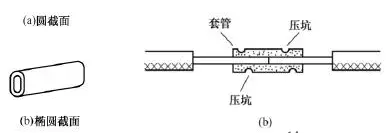 (1)銅導線或鋁導線的緊壓連接。壓接套管截面有圓形和橢圓形兩種,如圖12所示。圓截面套管內可以穿入一根導線,橢圓截面套管內可以并排穿入兩根導線。